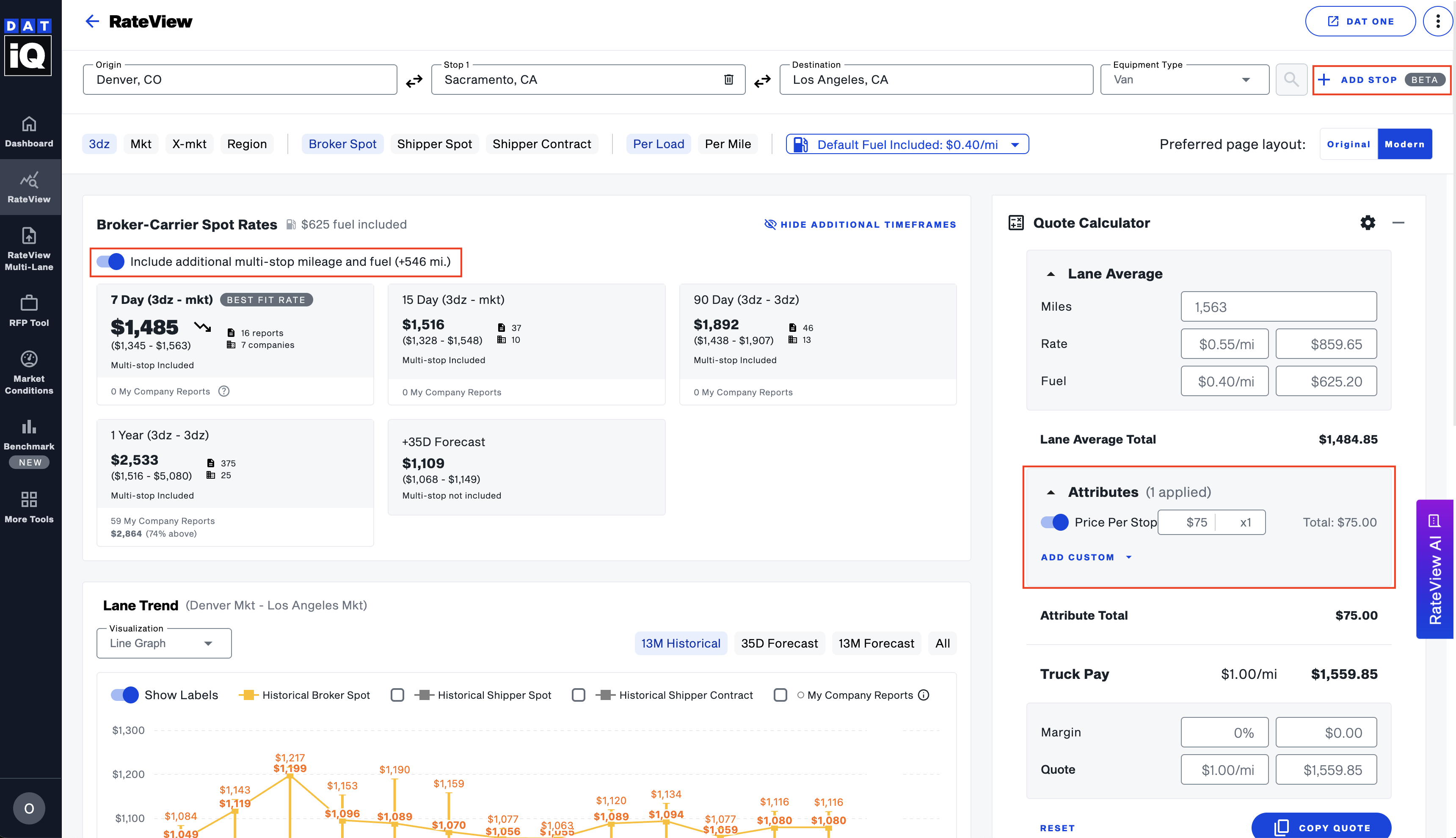 Note: This is not a newly modeled or DAT-created rate; it is a RateView rate that accounts for the full multi-stop mileage.