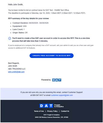 You will receive an email invitation from the shipper with a link to access the RFP. If you do not have a DAT account, you can sign up for free using the same email address.