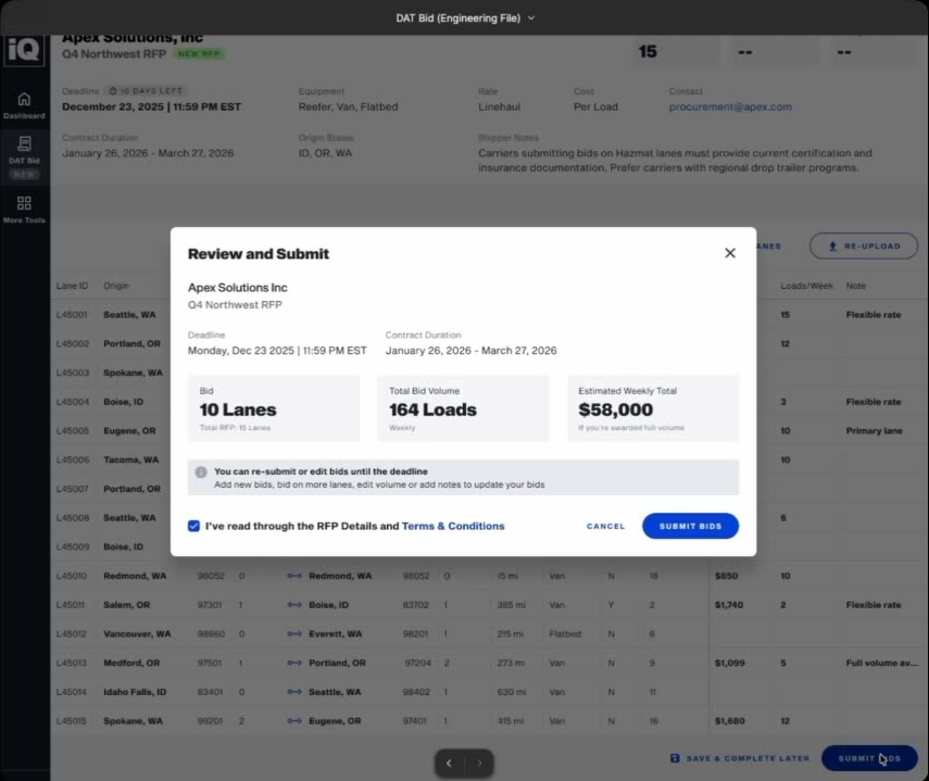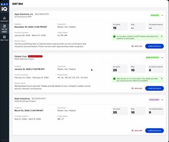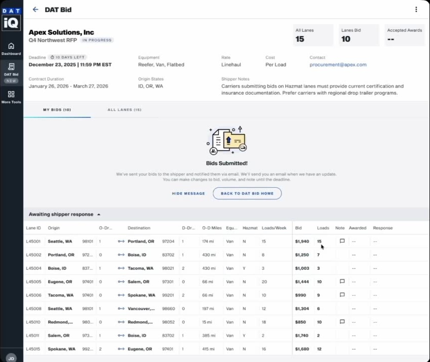 - Awaiting Shipper Response: Submitted bids where the shipper has not yet acted. You can still edit these before the deadline.